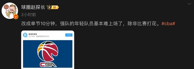 此前CBA联赛单节为12分钟赛制,与NBA相同,更多的比赛时间意味着更多的比赛回合,在部分胜负早早无悬念的比赛里,一些年轻球员可以得到机会上场,而改成10分钟赛制意味着一场比赛会减少8分钟时间,在外援当道的现有CBA模式下,本土球员的生存空间会被进一步压缩。