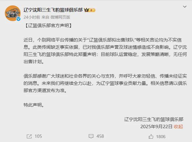 第三个消息,针对此前网络有不少媒体人爆料辽宁男篮疑似在兜售球队,辽宁男篮官方俱乐部正式发布声明如下:“辽篮俱乐部拟出售球队”等相关言论均为不实信息。这类传闻缺乏事实依据,对俱乐部声誉和球迷情感造成不良影响,辽宁男篮在此郑重声明,目前俱乐部稳定运营,发展策略清晰,无任何出售计划。