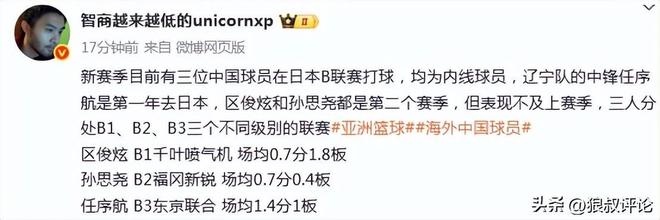 北京时间10月21日,根据媒体人“王健”的报道,新赛季目前有三位中国球员在日本B联赛打球,均为内线球员,辽宁队的中锋任序航是第一年去日本,区俊炫和孙思尧都是第二个赛季,但表现不