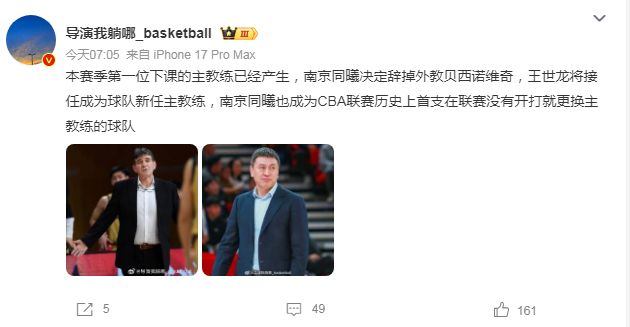 - CBA新赛季还没有拉开大幕,就有球队更换了主帅,南京同曦方面官宣,由于贝西诺维奇个人原因辞职,王世龙成为南京同...发表于: 12-09 19:44