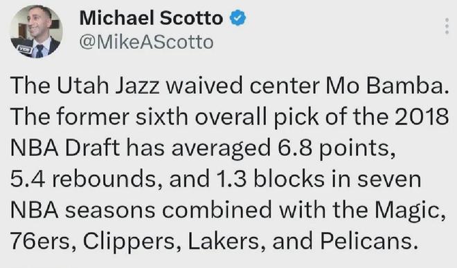 爵士官方宣布:裁掉穆罕默德-班巴。今年季前赛,班巴为爵士出战了一场比赛,对阵开拓者比赛中上阵不到9分钟,便砸出8分3板2助1帽全面数据。班巴出生于1998年5月12日,今年27岁,18届首