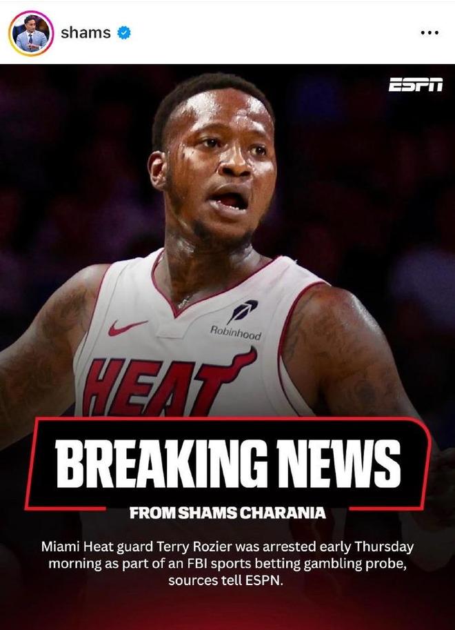 名记Shams随后也进行了相关报道,Shams表示,热火队后卫特里·罗齐尔于周四凌晨被捕,此事与联邦调查局(FBI)体育博彩调查有关。