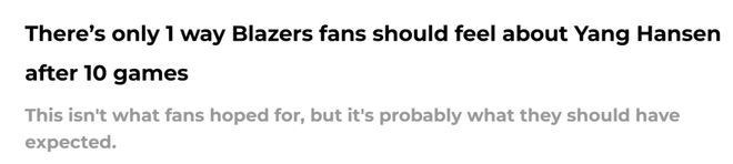 北京时间11月13日,开拓者125-117击败鹈鹕,杨瀚森连续第6场遭遇DNP,没有获得出场机会。美记Everts在波特兰媒体上撰文谈到杨瀚森。他认为这位中锋并没有掉队,因为不少首轮秀和他一样,也在适应NBA的节奏。以下是Everts的文章内容——