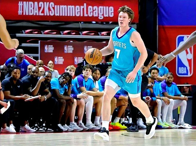 克尼普尔的优势从不是身体天赋,而是超越年龄的球商和稳定性。黄蜂教练组称赞他“像个老将”,他擅长通过无球跑动寻找空位,接球三分命中率稳定在40%以上;原本被认为是短板的持球进攻,在NBA赛场竟展现出不俗水准,对阵步行者的比赛中,他多次通过持球突破撕开步行者防线,送出精妙助攻。这种“用脑子打球”的风格,让他在新秀中显得格外与众不同。