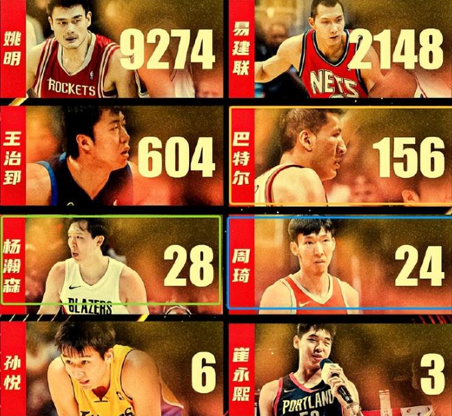 值得一提的是,杨瀚森也凭借对阵雷霆队的这场比赛拿到的8分,从而让他的NBA生涯总得分来到28分,力压周琦的24分,升至中国球员NBA得分榜第五位,恭喜!