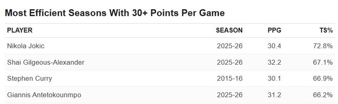 但闪耀的并非只有约基奇。这位掘金内线核心正朝着打破自己保持的单赛季球员效率值(PER)纪录迈进,而另外两位MVP得主——雄鹿队的字母哥和雷霆队的亚历山大也正在刷新这一纪录。据Stathead数据显示,截至北京时间本周二,在NBA历史上所有单赛季场均至少30分的96名球员中,约基奇、亚历山大和字母哥的真实命中率分别位列第一、第二和第四。排在第三的是勇士队球星库里在2015-16赛季的表现——那个赛季他成为了联盟历史上唯一一位全票MVP。