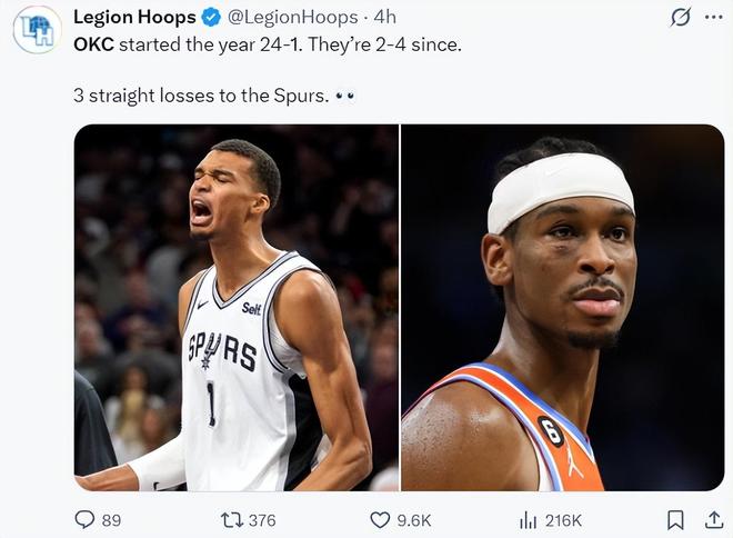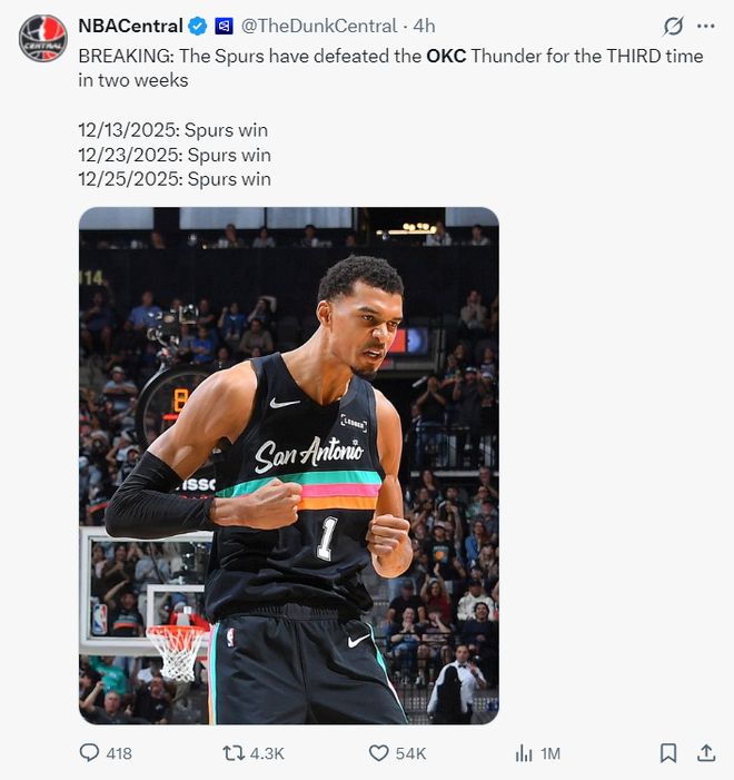 北京时间12月26日,NBA年终大战,马刺以117-102大胜雷霆拿到八连胜。这场比赛马刺是一直压制雷霆,首节领先5分,半场拉开到9分,第三节一波流拉开到15分,末节马刺牢牢掌控大局。联盟第一的雷霆毫无还手之力,文班亚马再一次压制了SGA,这让SGA的连庄MVP蒙上阴影。