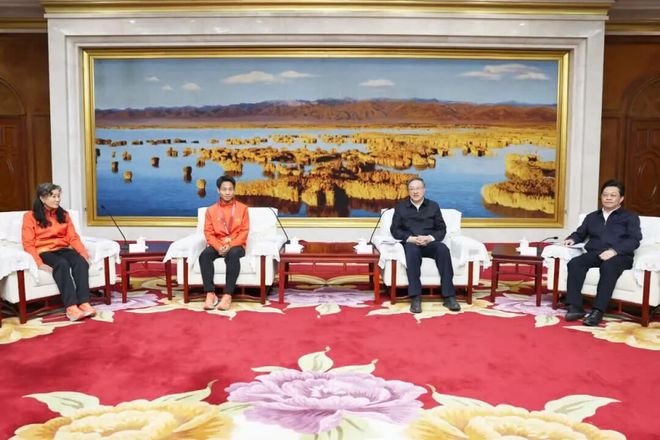 11月22日,李邑飞、张雨浦在银川会见第十五届全运会宁夏体育代表团和全国体育系统先进集体、群众体育先进个人代表,并与大家座谈交流。 “宁夏日报”微信公众号图