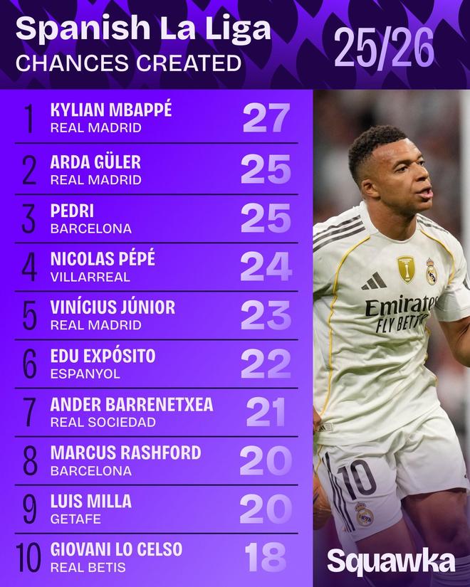 北京时间10月29日,知名数据平台Squawka列出了本赛季西甲联赛中创造机会最多的球员榜单,皇马球星姆巴佩27次领跑榜单,居莱尔、佩德里25次紧随其后。