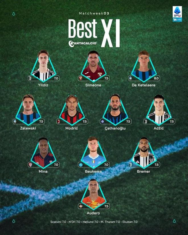 意甲官方公布了第3轮联赛最佳阵容,莫德里奇、凯南-伊尔迪兹和布雷默等人在列。