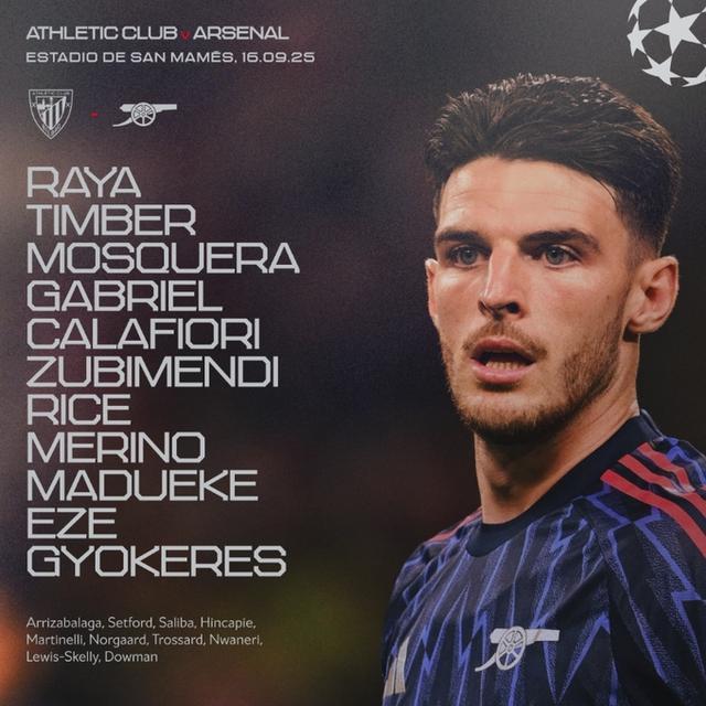 直播吧09月16日宣 欧冠联赛阶段第1轮,毕尔巴鄂竞技主场迎战阿森纳,赛前首发名单公布。本场比赛厄德高、萨卡、哈弗茨、本-怀特因伤缺战,新援约克雷斯、埃泽、马杜埃凯出战,萨利