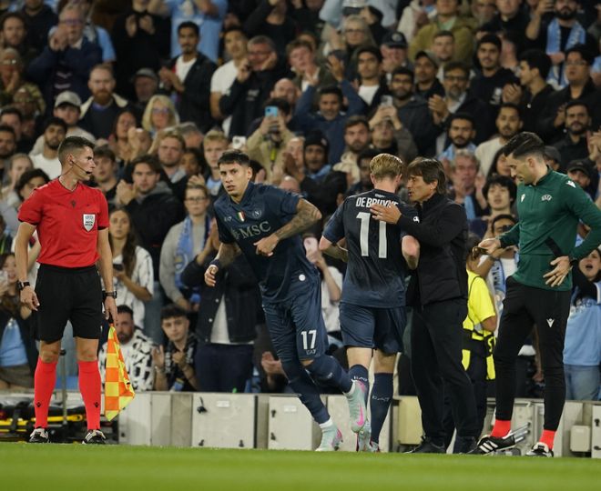 这一个比赛日,曼城迎来了新赛季欧冠第一阶段首场比赛的考验,坐镇主场伊蒂哈德球场,迎战来访的意甲球队那不勒斯,本场比赛哈兰德上半场造成迪洛伦佐染红,亲手把德布劳内送下场,易边再战哈兰德和多库分别建功,帮助曼城2-0完胜那不勒斯。