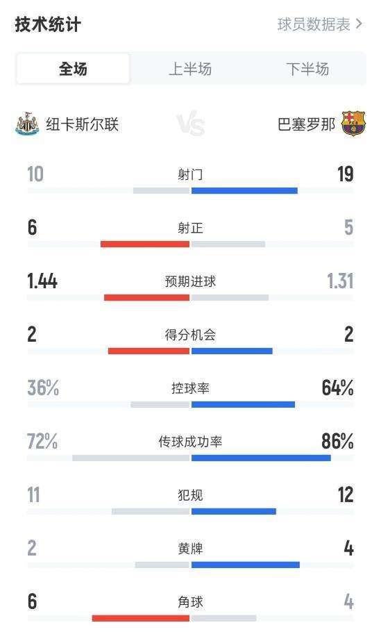 纽卡12巴萨全场数据:射门1019,射正65,控球率36%64%
