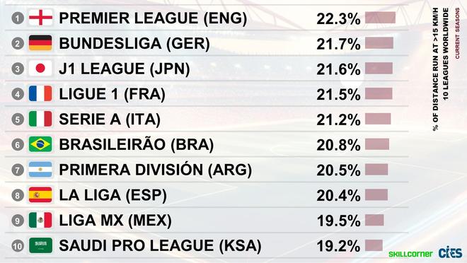 足球天文台(CIES Football Obs)统计了各联赛高速跑(速度>15km/h)距离占比,其中英超联赛22.3%排名第一,德甲21.7%排名第二,J1联赛21.6%排名第三,另外法甲21.5%排名第四,意甲21.2%排名第