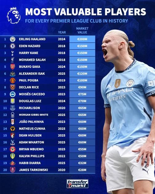 - 北京时间11月11日,德转统计出了本赛季英超20家俱乐部历史身价最高的球员,2024年身价曾达到2亿欧元的哈兰德独...发表于: 11-12 11:39