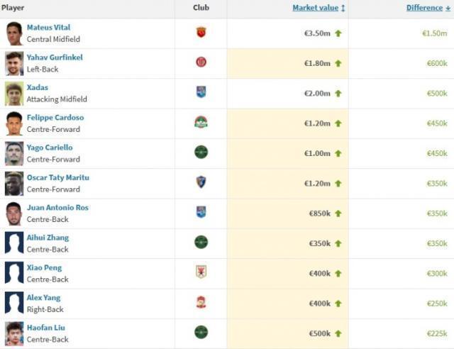 球员方面,海港外援维塔尔上涨150万欧元,成为了本期身价涨幅最高的中超球员。